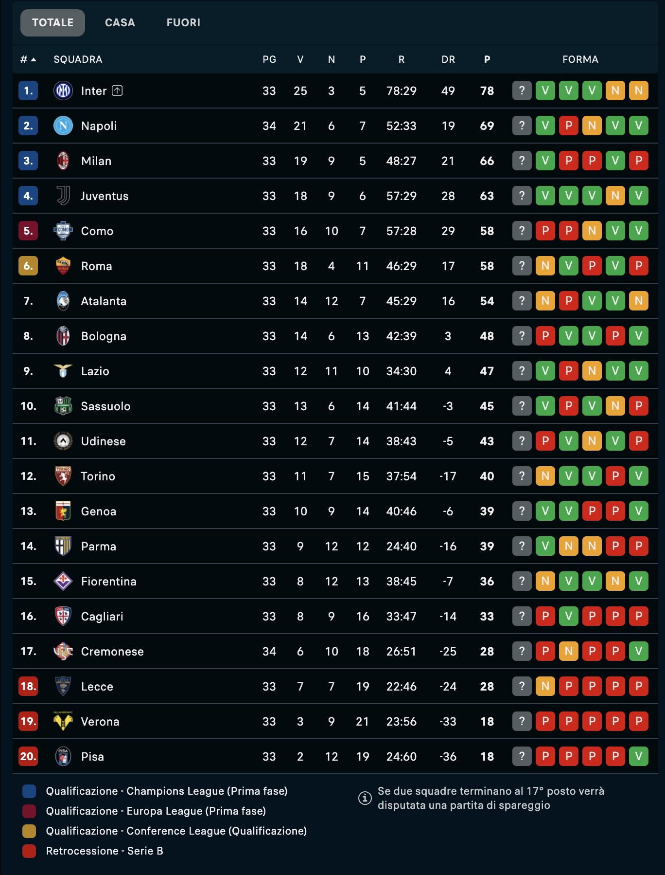 Il Napoli torna alla vittoria e per la prima volta in stagione lo fa con una goleada. La squadra di Antonio Conte s'impone 4-0 contro la Cremonese e si riporta da sola al secondo in classifica a -9 dalla capolista Inter e scavacaldo di 3 punti il Milan, che domani affronterà la Juventus quarta in classifica staccata ora di 6 punti. Gli azzurri hanno inoltre un largo margine sul quinto posto occupato da Como e Roma, 11 punti. Di seguito la classifica di Serie A aggiornata.