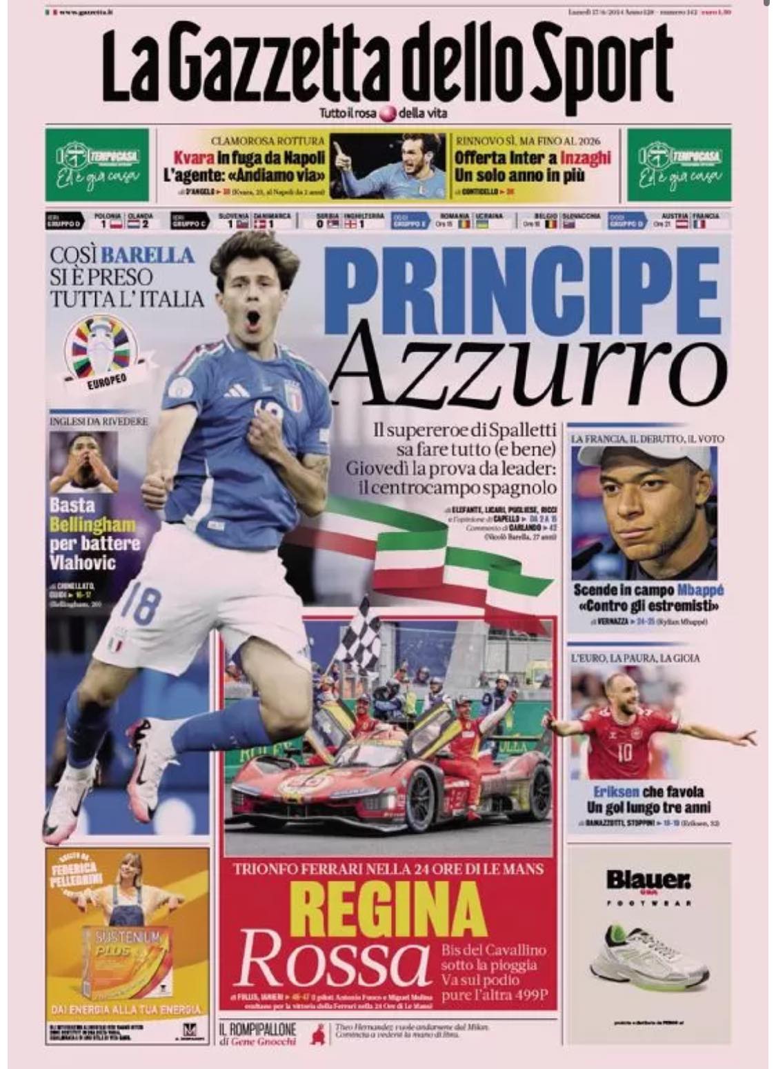 Nell'edizione odierna, la Gazzetta dello Sport apre in prima pagina con Barella, decisivo nell'esordio dell'Italia agli Europei: "Principe Azzurro". In taglio alto spazio alla clamorosa rottura innescata dalle parole dell'agente di Khvicha Kvaratskhelia: "Kvara in fuga da Napoli. L'agente: 'Andiamo via'". Sempre in taglio alto il rinnovo di Simone Inzaghi: "Offerta Inter a Inzaghi. Un solo anno in più". Di seguito la prima pagina integrale.