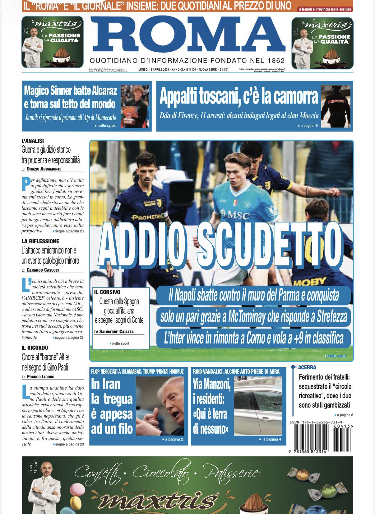 Nell'edizione di oggi, Il Roma apre in prima pagina con pareggio del Napoli a Parma, che mette fine al sogno scudetto della squadra di Antonio Conte: "Addio Scudetto. Il Napoli sbatte contro il muro del Parma e conquista solo un pari grazie a McTominay che risponde a Strefezza. L'Inter vince in rimonta a Como e vola a +9 in classifica". Di seguito la prima pagina integrale.