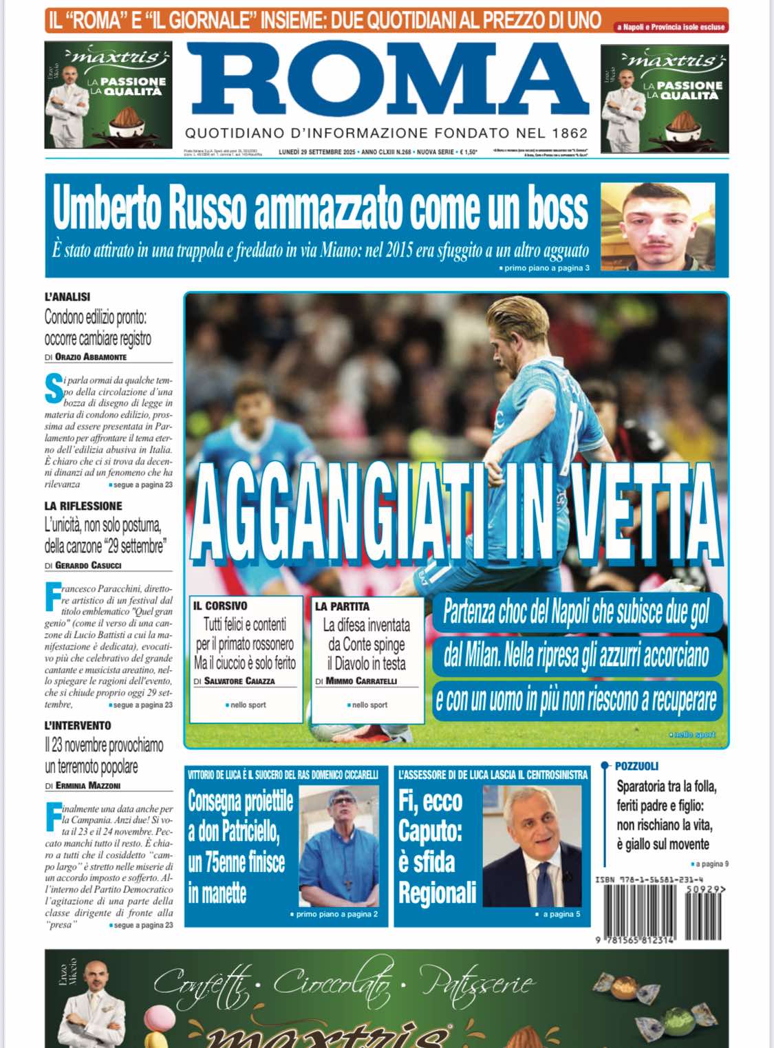 Nell'edizione di oggi, Il Roma dedica la prima pagina alla prima sconfitta del Napoli in campionato che vale l'aggancio in classifica ai campioni d'Italia di Milan e Roma: "Agganciati in vetta. Partenza choc del Napoli che subisce due gol dal Milan. Nella ripresa gli azzurri accorciano e con un uomo in più non riescono a recuperare". Di seguito la prima pagina integrale.
