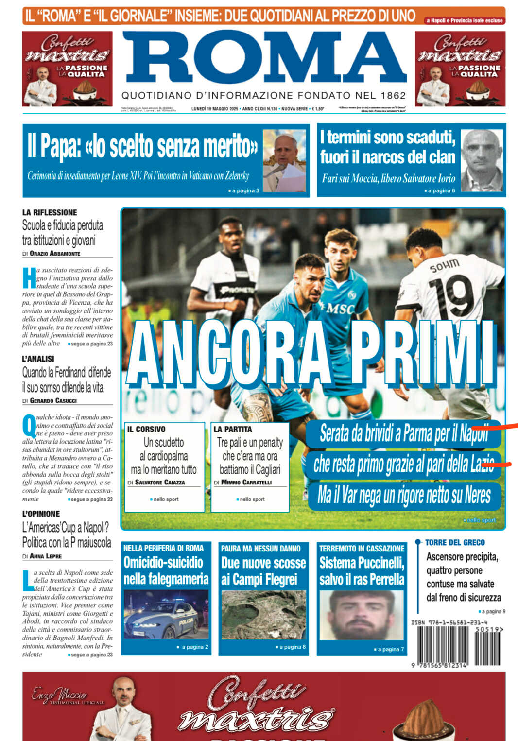 Nell'edizione di oggi, Il Roma dedica la prima pagina al Napoli che nonostante il pareggio di Parma resta da solo in testa alla classifica ad una giornata dal termine del campionato: "Ancora primi. Serata da brividi a Parma per il Napoli che resta primo grazie al pari della Lazio. Ma il Var nega un rigore netto su Neres". Di seguito la prima pagina integrale.