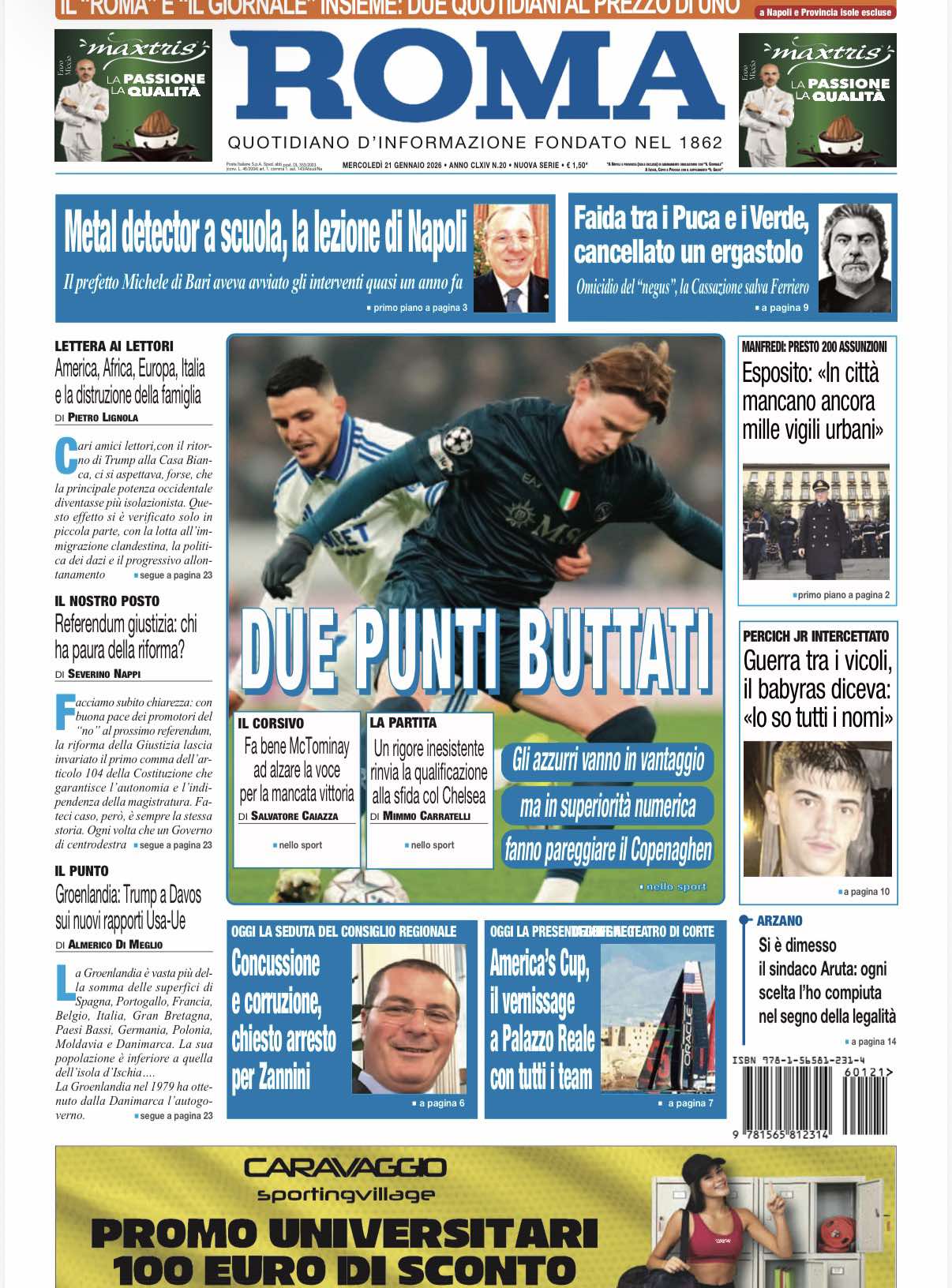 "Due punti buttati", apre così Il Roma nella prima pagina odierna, commentando il deludente passo falso del Napoli in Champions League. Il sommario: "Gli azzurri vanno in vantaggio, ma in superiorità numerica fanno pareggiare il Copenhagen". Di seguito la prima pagina integrale.