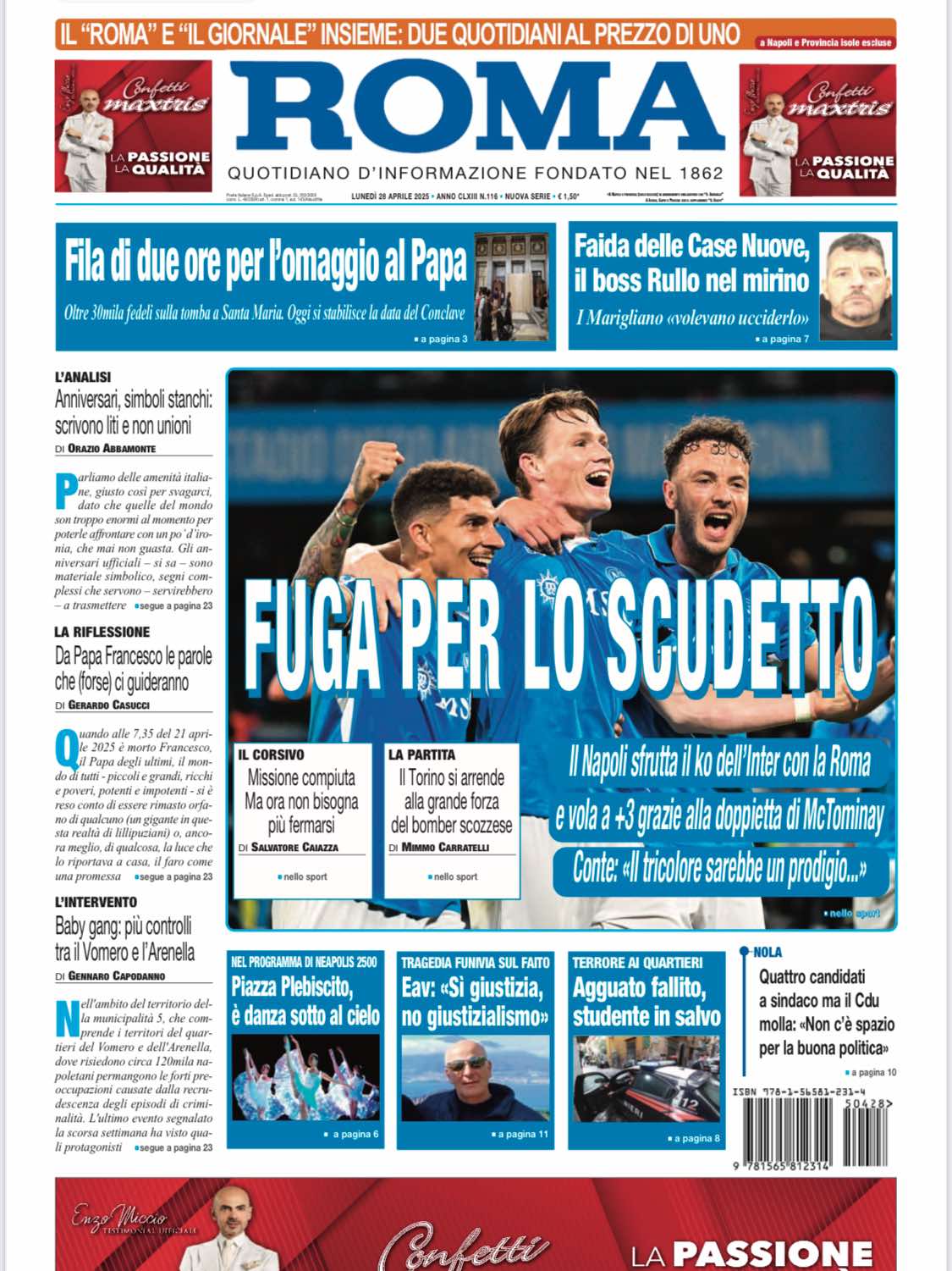 Nell'edizione odierna, Il Roma dedica l'apertura in prima pagina alla vittoria del Napoli contro il Torino che manda gli azzurri in vetta da soli alla classifica: "Fuga per lo scudetto. Il Napoli sfrutta il ko dell'Inter con la Roma e vola a +3 grazie alla doppietta di McTominay. Conte: 'Il tricolore sarebbe un prodigio'". Di seguito la prima pagina integrale.