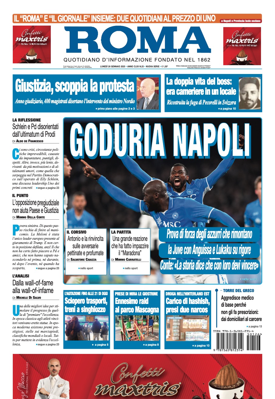 Nell'edizione di oggi, Il Roma dedica l'apertura in prima pagina alla vittoria in rionta del Napoli contro la Juventus: "Goduria Napoli. Prova di forza degli azzurri che rimontano la Juve con Anguissa e Lukaku su rigore. Conte: 'La storia dice che con loro devi vincere'". Di seguito la prima pagina integrale.