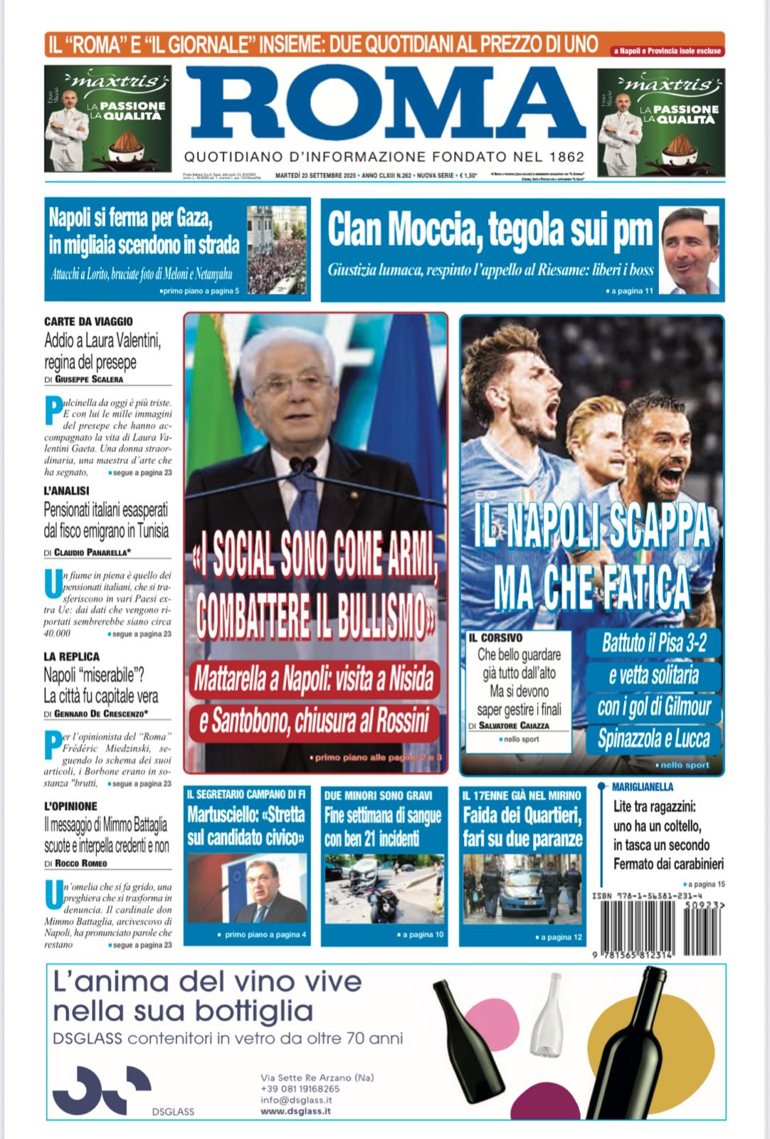 "Il Napoli scappa, ma che fatica", apre così in prima pagina Il Roma nell'edizione odierna, parlando del successo in campionato della squadra di Antonio Conte che ha però rischiato molto nel finale. Il sommario: "Battuto il Pisa 3-2 e vetta solitaria con i gol di Gilmour, Spinazzola e Lucca". Di seguito la prima pagina integrale.