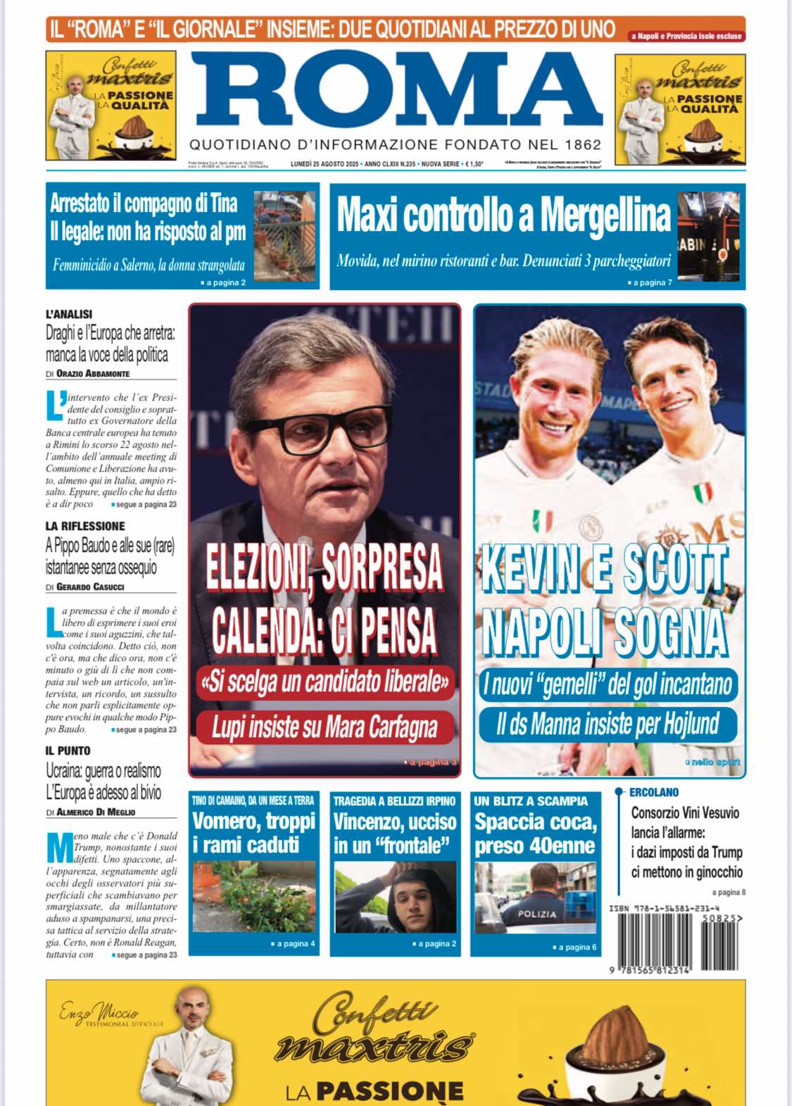 Nell'edizione odierna, Il Roma dedica l'apertura in prima pagina al Napoli che vince all'esordio in campionato: "Kevin e Scott, Napoli sogna. I nuovi 'gemelli' del gol incantano". Spazio anche al mercato: "Il ds Manna insiste per Hojlund". Di seguito la prima pagina integrale.