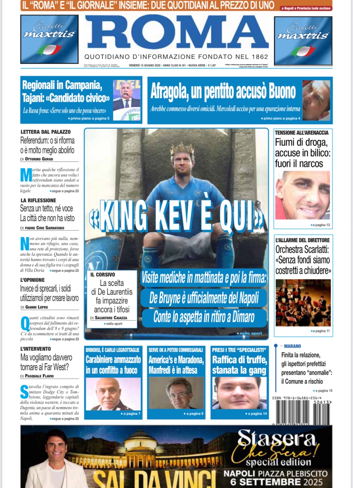 "King Kev è qui". E' questo il titolo che Il Roma dedica al Napoli in prima pagina. Il riferimento è chiaramente a Kevin De Bruyne, che da ieri è ufficialmente un nuovo giocatore del Napoli. “Visite mediche in mattinata e poi la firma. De Bruyne è ufficialmente del Napoli. Conte lo aspetta in ritiro a Dimaro”. Di seguito la prima pagina completa.