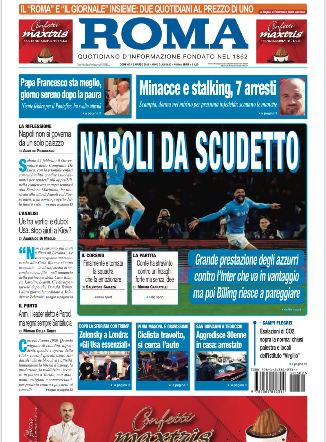 "Napoli da Scudetto", scrive così in prima pagina il quotidiano Il Roma nell'edizione odierna, in riferimento all'ottima prova degli uomini di Conte contro l'Inter capolista. Il sommario: "Grande prestazione degli azzurri contro l'Inter che va in vantaggio, ma poi Billing riesce a pareggiare". Di seguito la prima pagina integrale.