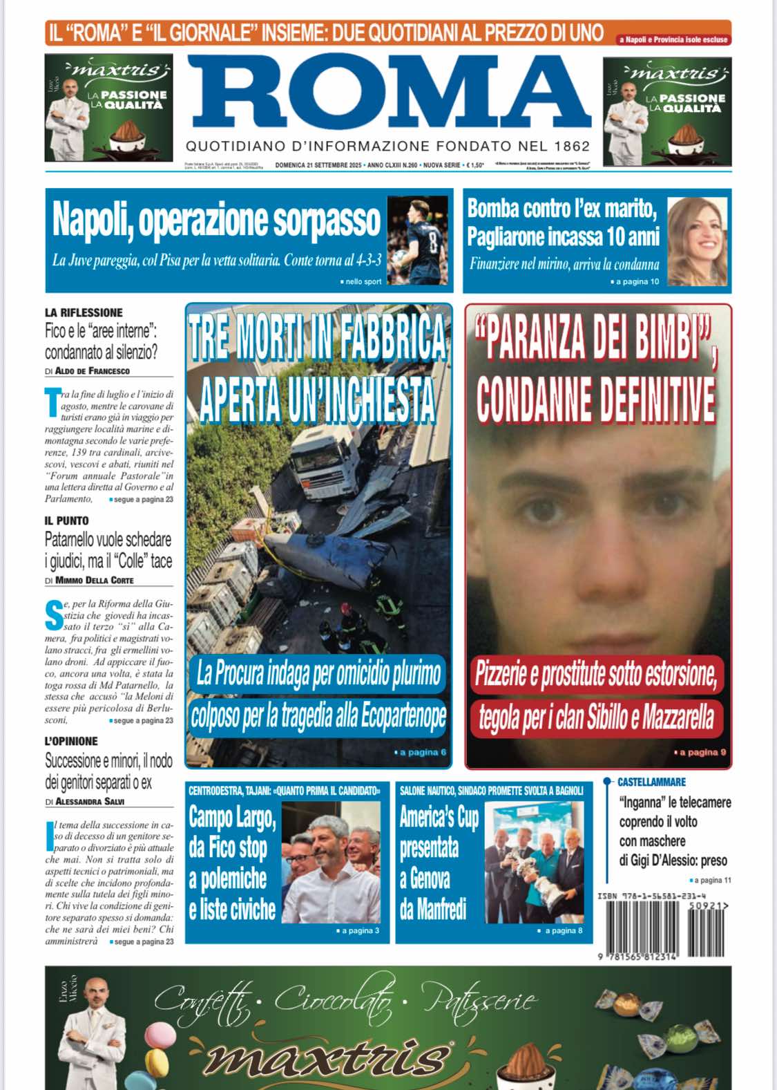 “Napoli, operazione sorpasso”, apre così in prima pagina il quotidiano napoletano Il Roma nell'edizione odierna. Il sommario: “La Juve pareggia, con il Pisa per la vetta solitaria. Conte torna al 4-3-3”. Di seguito la prima pagina integrale.