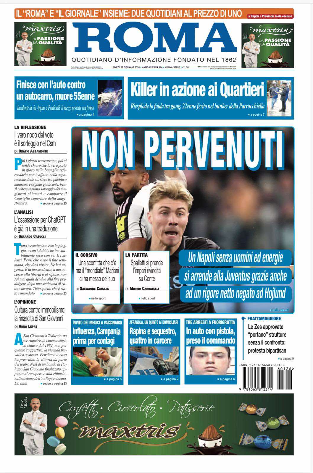 "Non pervenuti": così titola l'edizione odierna de Il Roma. Un Napoli senza uomini ed energie si arrende alla Juventus, travolto più dalla propria impotenza che dall’avversario. Poche idee, ritmo basso, nessuna vera scossa: allo Stadium gli azzurri restano ai margini della partita, incapaci di incidere.