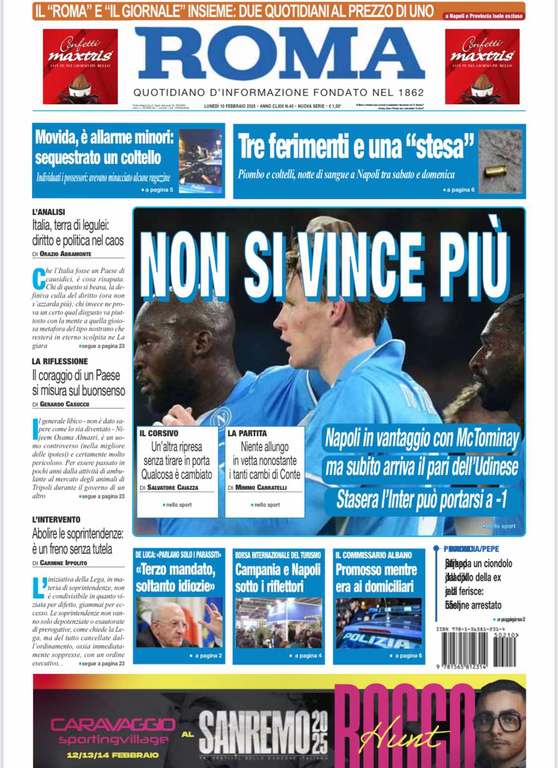 Nell'edizione di oggi, Il Roma dedica l'apertura in prima pagina al secondo pareggio consecutivo del Napoli, 1-1 come con la Roma anche con l'Udinese: "Non si vince più. Napoli in vantaggio con McTominay, ma subito arriva il pari dell'Udinese. Stasera l'Inter può portarsi a -1". Di seguito la prima pagina integrale.