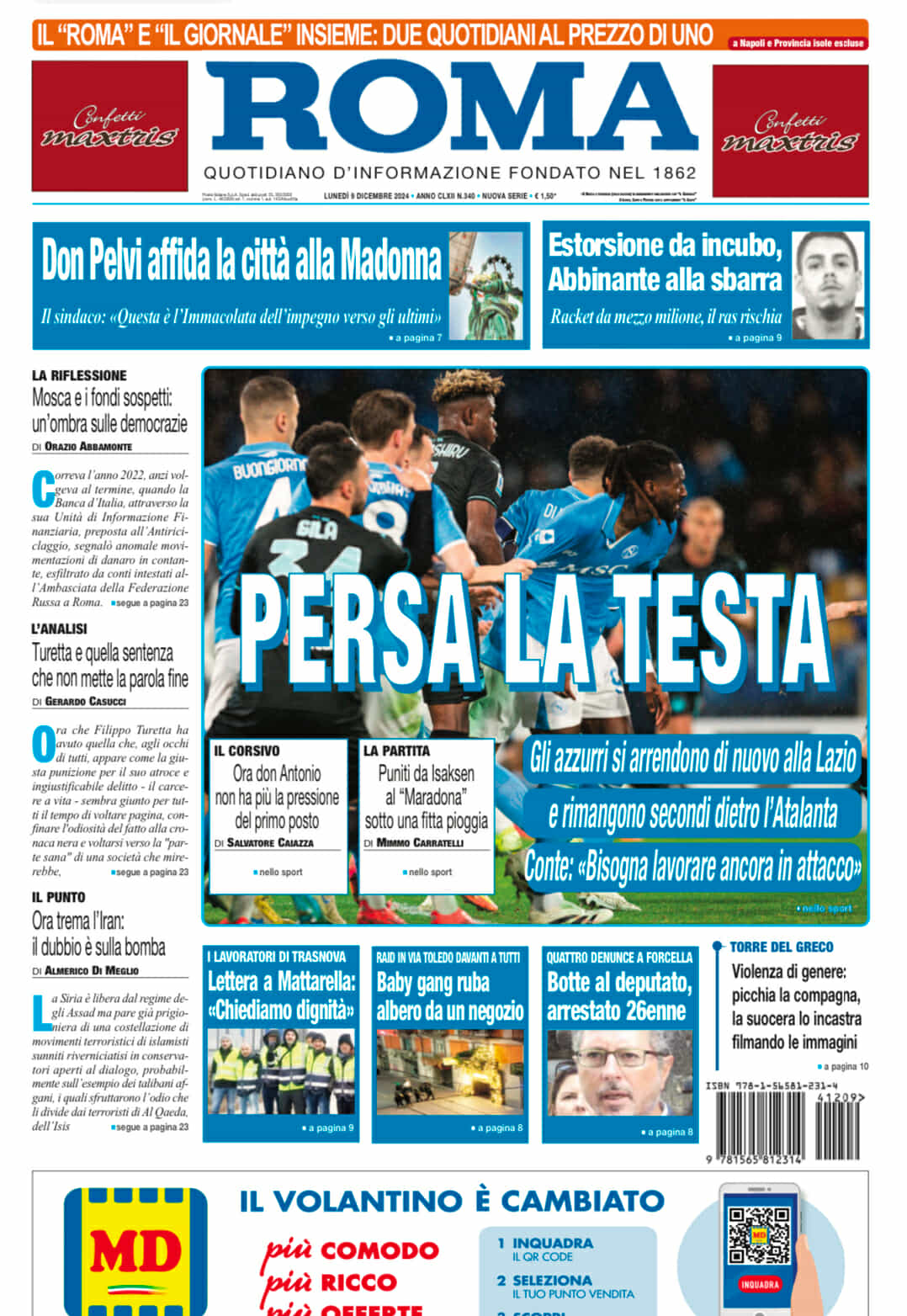 Nell'edizione di oggi, Il Roma dedica l'apertura in prima pagina al ko del Napoli al Maradona contro la Lazio che frena gli azzurri in classifica: "Persa la testa. Gli azzurri si arrendono di nuovo alla Lazio e rimangono secondi dietro l'Atalanta. Conte: 'Bisogna lavorare ancora in attacco'". Di seguito la prima pagina integrale.