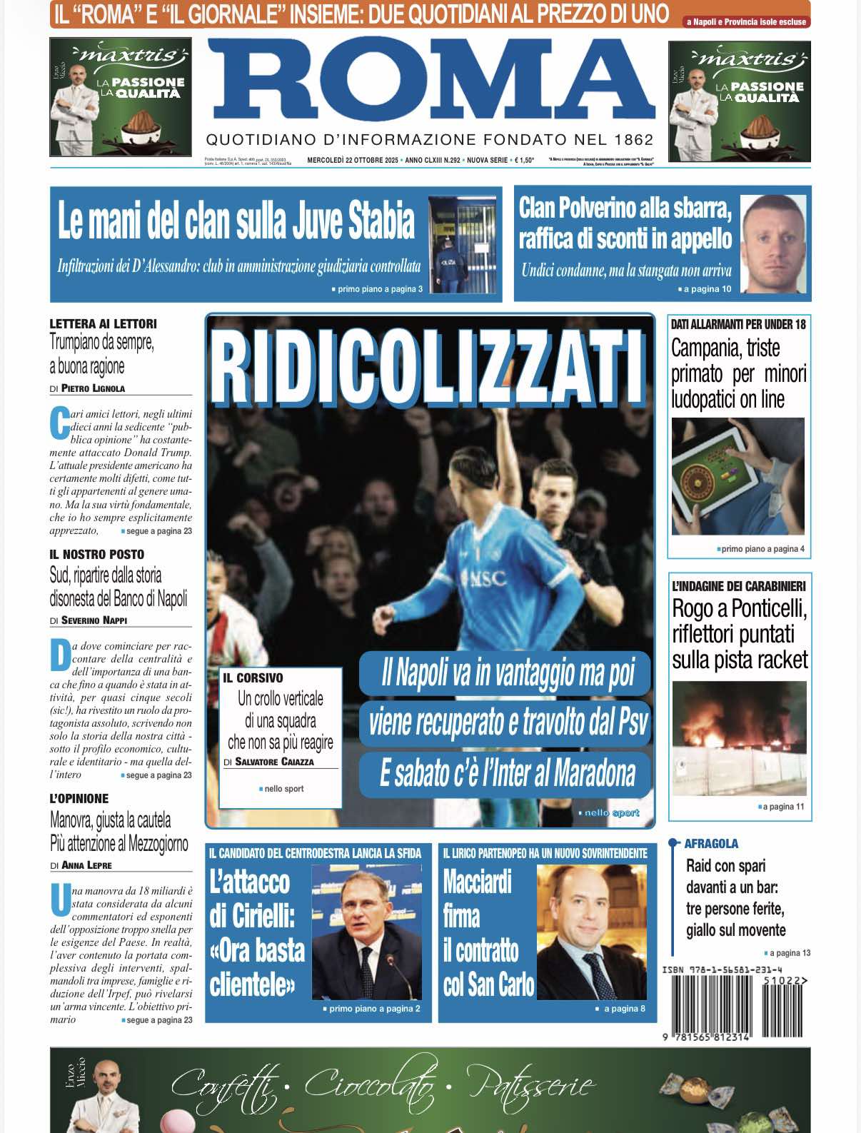 Nell'edizione di oggi, Il Roma dedica l'apertura in prima pagina alla debacle del Napoli in Champions League ad Eindhoven: "Ridicolizzati. Il Napoli va in vantaggio ma poi viene recuperato e travolto dal Psv. E sabato c'è l'Inter al Maradona". Di seguito la prima pagina integrale.
