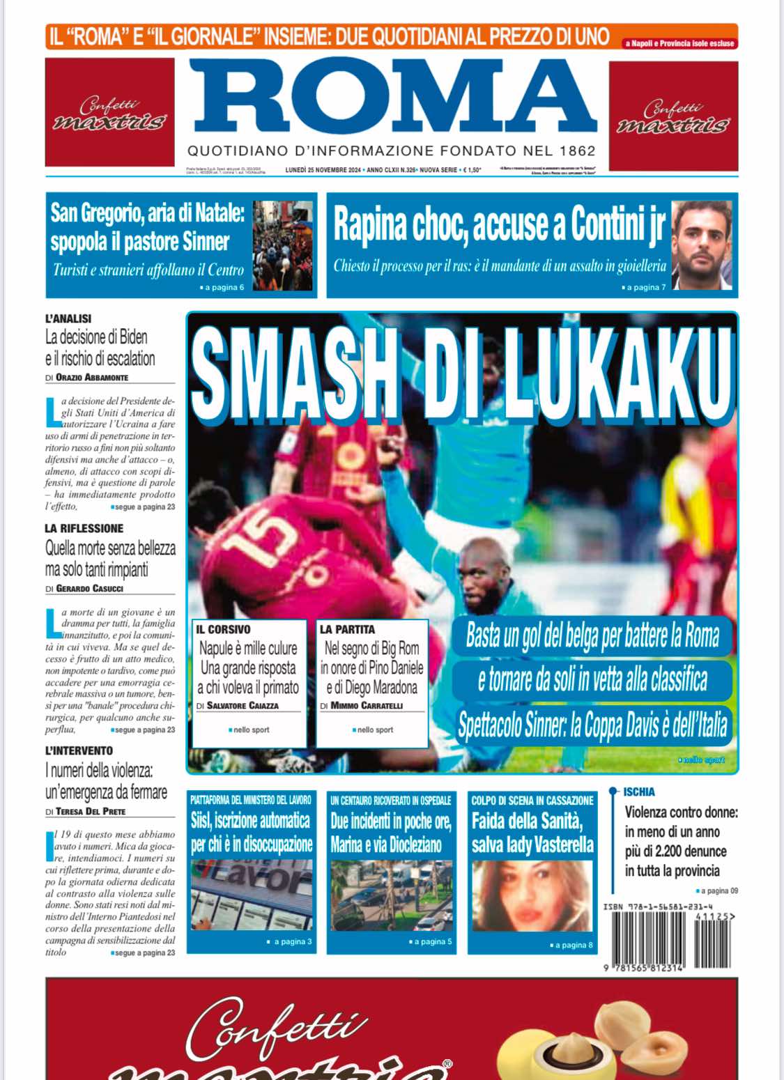 Nell'edizione di oggi, Il Roma dedica l'apertura alla vittoria del Napoli contro la Roma grazie alla rete dell'ex Romelu Lukaku: "Smash di Lukaku. Basta un gol del belga per battere la Roma e tornare da soli in vetta alla classifica". C'è spazio anche alla vittoria della Coppa Davis da parte della Nazionale di tennis: "Spettacolo Sinner: la Coppa Davis è dell'Italia". Di seguito la prima pagina integrale.