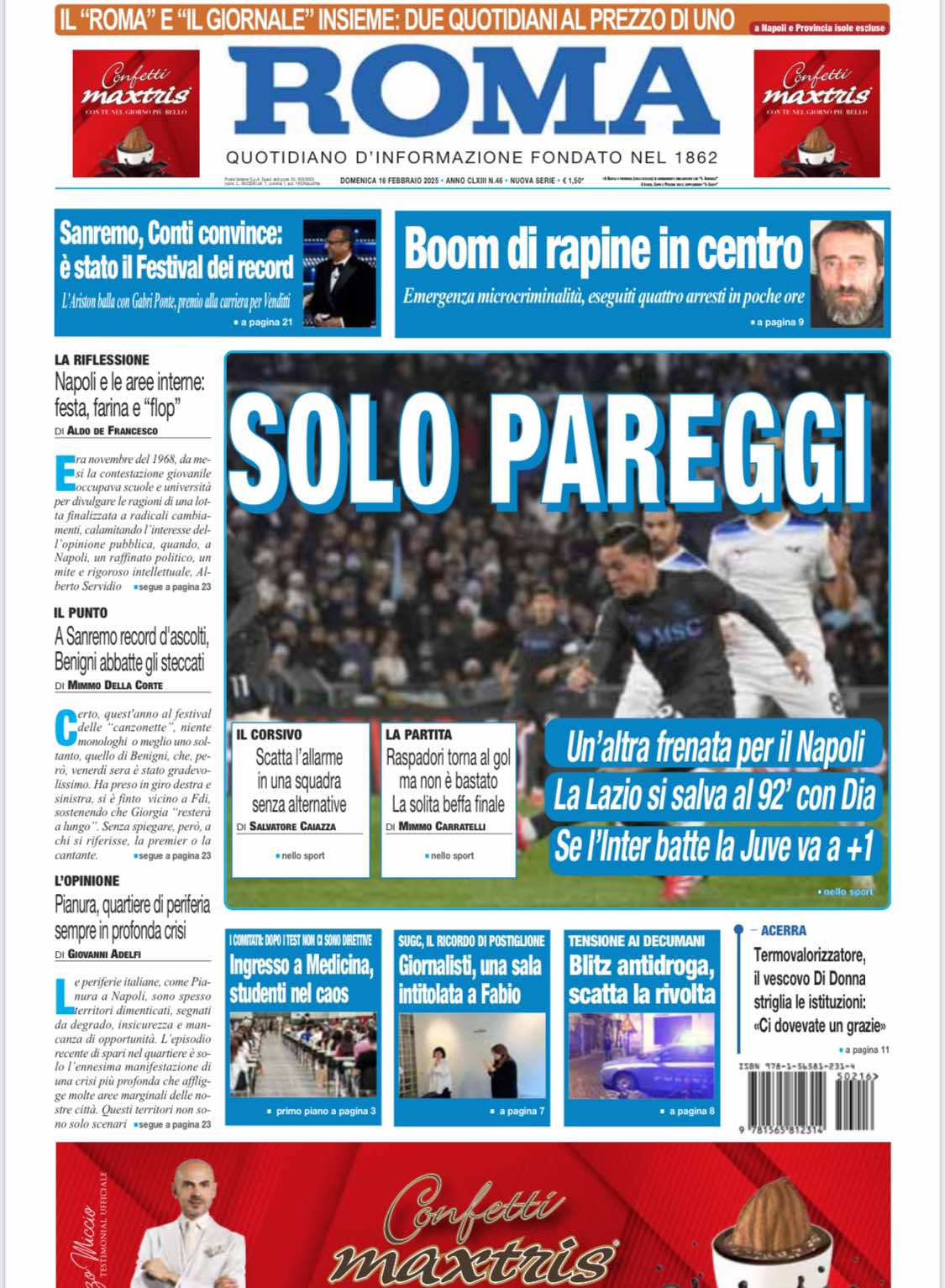 "Solo pareggi", apre così in prima pagina Il Roma nell'edizione odierna, facendo riferimento al pari del Napoli contro la Lazio che è il terzo consecutivo dopo quelli con Roma e Udinese. Il sommario: "Un'altra frenata per il Napoli. La Lazio si salva al 92' con Dia. Se l'Inter batte la Juve va a +1". Di seguito la prima pagina integrale.
