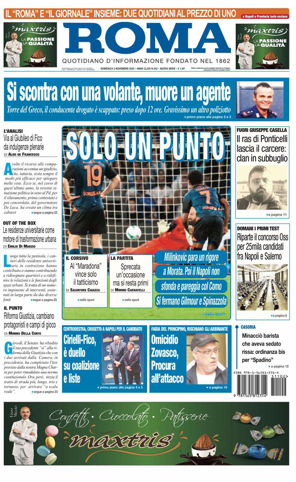 "Solo un punto", apre così il quotidiano Il Roma nella prima pagina odierna, facendo riferimento allo 0-0 maturato dalla squadra di Conte contro quella di Fabregas. Il sommario: "Milinkovic para un rigore a Morata. Poi il Napoli non sfonda e pareggia col Como. Si fermano Gilmour e Spinazzola". Di seguito la prima pagina integrale.