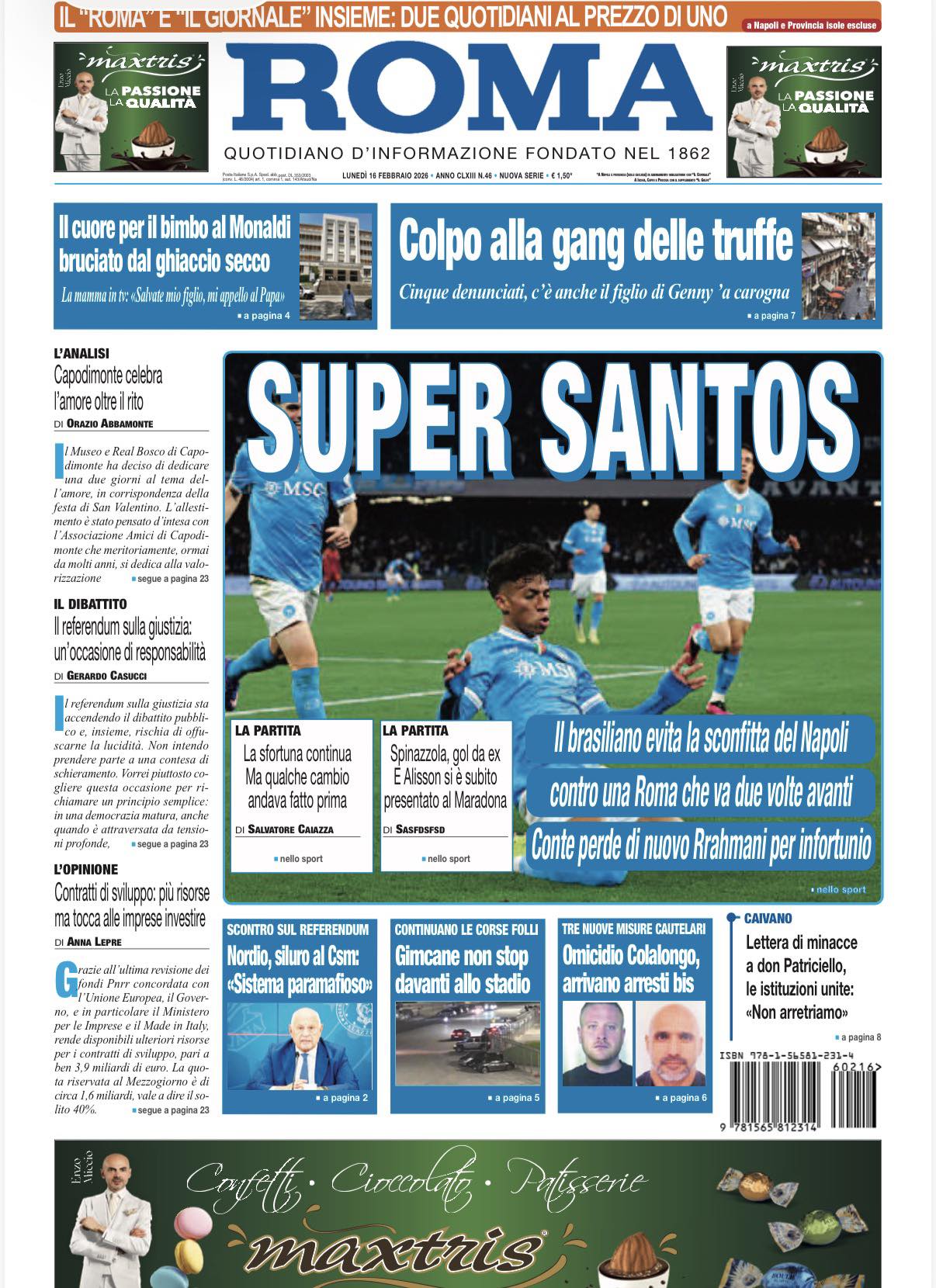 Nell'edizione di oggi, Il Roma dedica l'apertura in prima pagina ad Alisson Santos, il nuovo attaccante del Napoli riprende la Roma sul 2-2: "Super Santos. Il brasiliano evita la sconfitta del Napoli contro una Roma che va due volte avanti. Conte perde di nuovo Rrahmani per infortunio". Di seguito la prima pagina integrale.