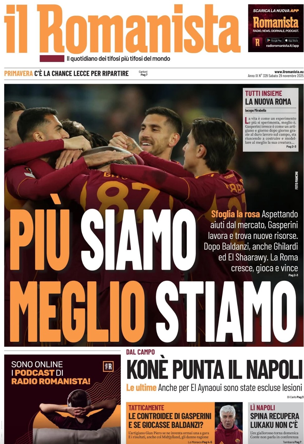 “Più siamo meglio stiamo”, è il titolo del quotidiano Il Romanista, punto di riferimento del tifoso giallorosso in riferimento al lavoro di Gasperini che sta scoprendo nuove risorse con Ghilardi, dopo Baldanzi ed El Shaarawy, aspettando gli aiuti dal mercato. La Roma vince e cresce mentre in taglio centrale Koné e El Aynaoui che puntano il Napoli: sono state escluse lesioni per loro.