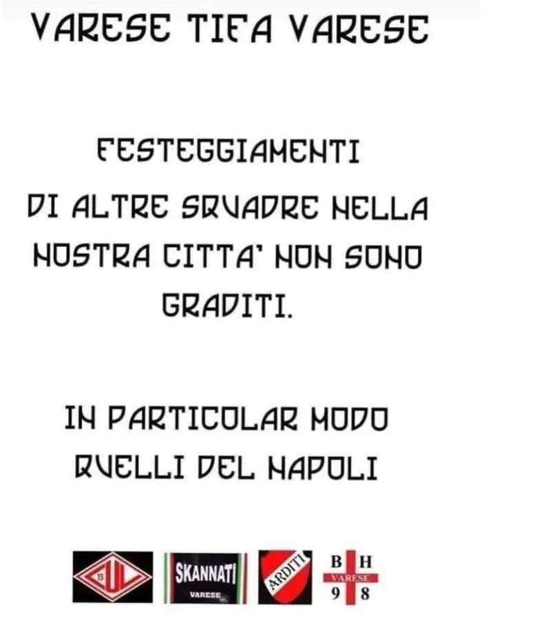 Anche nelle altre città di Italia (e non solo) i tifosi del Napoli sono pronti a scendere in strada per festeggiare il tanto agognato Scudetto. Ha dell'incredibile, però, quanto potrebbe accadere a Varese, dove addirittura gli ultras vorrebbero vietare i festeggiamenti. Di seguito il comunicato diramato dai gruppi organizzati del Varese: "Varese tifa Varese. Festeggiamenti di altre squadre nella nostra città non sono graditi. In particolar modo quelli del Napoli".
