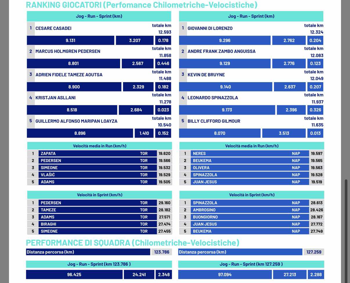 Il centrocampista belga, impegiegato da Antonio Conte anche da regista nei minuti dell'assedio finale ai granata, è stato tra i top 3 che ha macinato più chilometri in campo. L'ex Manchester City ha percorso ben 12km, meglio di lui solo Di Lorenzo e Anguissa con una manciata di metri in più. Di seguito i dati ufficiali della Lega Serie A.