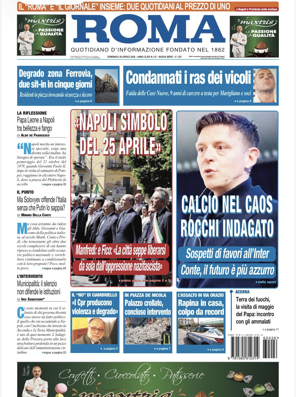 "Calcio nel caos, Rocchi indagato". Il terremoto che ha investito il calcio italiano finisce in prima pagina anche su Il Roma. "Sospetti di favori all'Inter", si legge ancora. Il quotidiano si sofferma poi sul futuro della panchina del Napoli e fa sapere che ora Conte è più vicino alla permanenza.