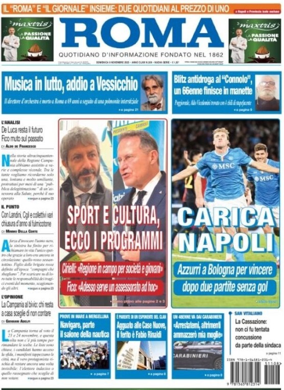 "Carica Napoli". E' questo il titolo scelto da Il Roma per aprire oggi la prima pagina in vista di Bologna-Napoli. "Azzurri a Bologna per vincere dopo due partite senza gol", si legge ancora sul quotidiano.