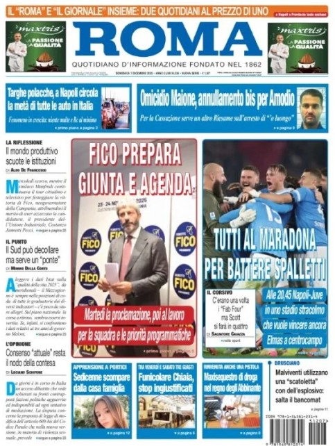 "Tutti al Maradona per battere Spalletti". E' questo il titolo con cui Il Roma apre oggi in prima pagina, nel giorno di Napoli-Juventus. Si giocherà - si legge - in uno stadio stracolmo che vuole vincere ancora. Per quanto riguarda la formazione, sarà Elmas a rimpiazzare l'infortunato Lobotka.