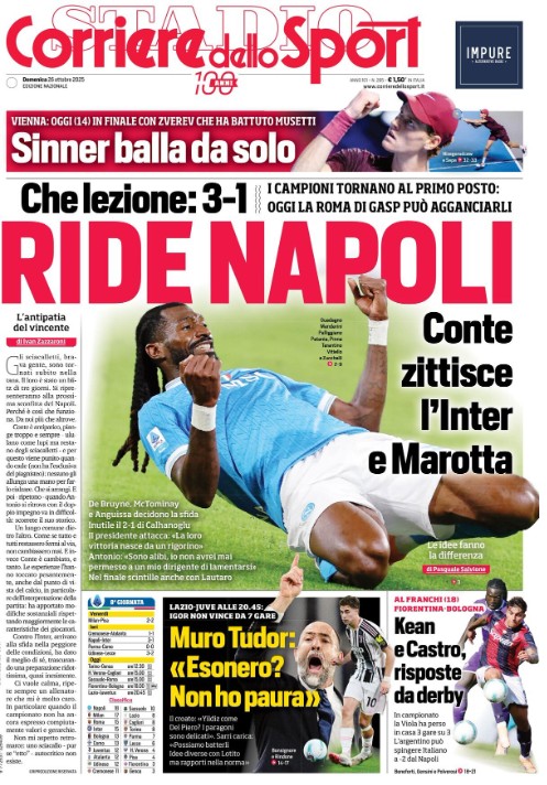 In aggiunta il quotidiano scrive: "De Bruyne, McTominay e Anguissa decidono la sfida. Inutile il 2-1 di Calhanoglu. Il presidente attacca: "La loro vittoria nasce da un rigorino". Antonio: "Sono alibi: io non avrei mai permesso a un mio dirigente di lamentarsi". Nel finale scintille anche con Lautaro". Poi sulla Juventus: "Muro Tudor: 'Esonero? Non ho paura'. Lazio-Juve alle 20.45: Igor non vince da 7 gare".