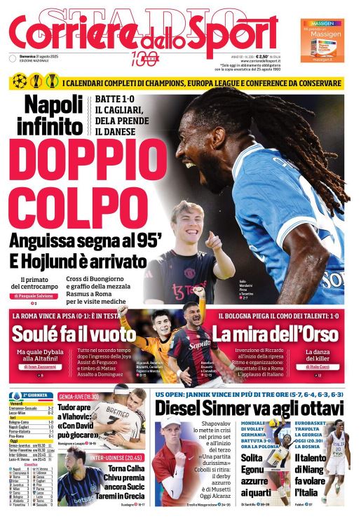 "Doppio colpo". E' questo il titolo con cui il Corriere dello Sport apre in prima pagina all'indomani del successo del Napoli all'ultimo respiro contro il Cagliari. Il riferimento è il successo sul campo e all'altro colpo, quello di mercato: Hojlund è arrivato in Italia e oggi sosterrà le visite mediche con gli azzurri.