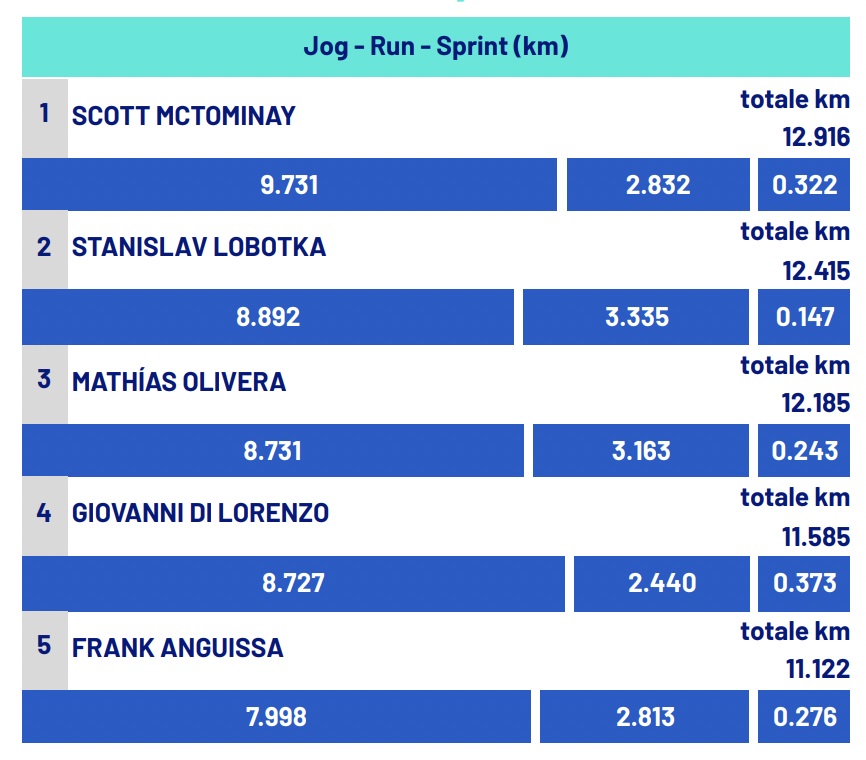 Ancora una volta l'ex Manchester United corre più di 12km in un match di Serie A, dietro di lui con circa 500 in meno percorso Stanislav Lobotka. Seguono Olivera, Di Lorenzo e Anguissa. Di seguito i dati ufficiali pubblicati dalla Lega Serie A.