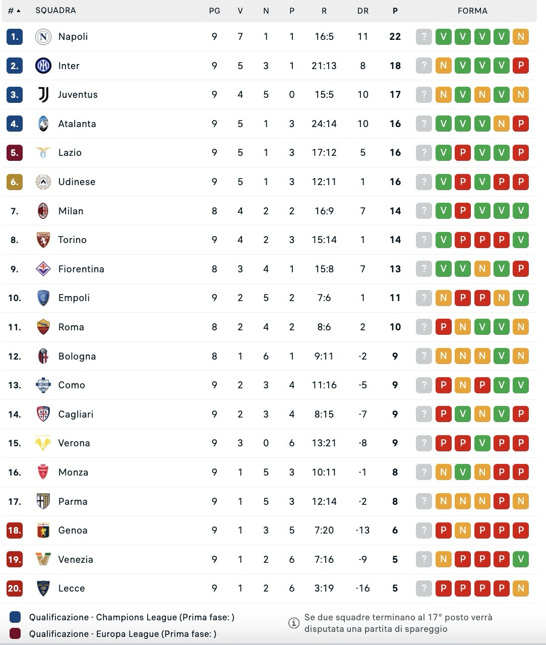 Nel tanto atteso derby d'Italia, Inter e Juventus pareggiano con un roboante 4-4, e ad uscirne vincitore è Antonio Conte. Grazie al pari tra le due dirette concorrenti, il Napoli allunga di due punti su entrambe con la vittoria sul Lecce: ora gli azzurri sono a +4 sull'Inter e a +5 sulla Juve.