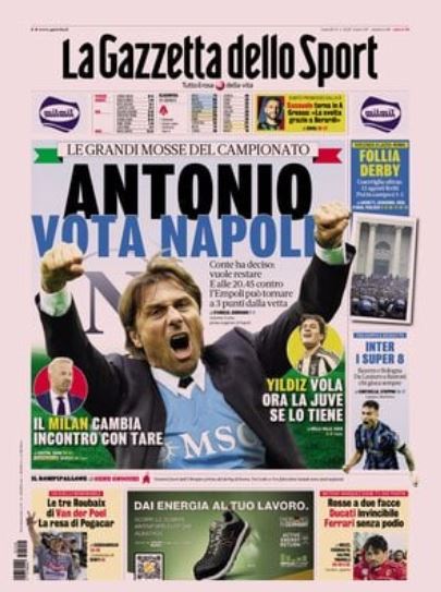 "Antonio vota Napoli: Conte ha deciso, vuole restare" si legge in prima pagina su La Gazzetta dello Sport oggi in edicola.
