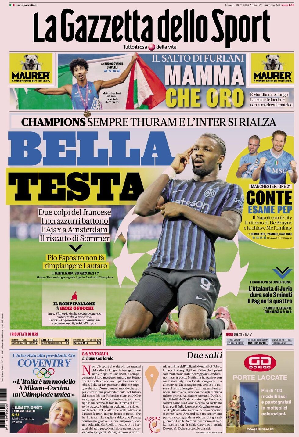 Una doppietta nata da due colpi di testa dove ha lasciato trasparire il dominio fisico sugli avversari. Così Marcus Thuram ha mandato al tappeto l'Ajax al debutto stagionale in Champions League ad Amsterdam: "Bella testa", titola appositamente La Gazzetta dello Sport in prima pagina sulla ripresa dell'Inter. Sommer, dopo la marea di critiche ricevute al Derby D'Italia per gli svarioni con la Juventus, si prende la sua rivincita mentre Pio Esposito (titolare) non ha fatto rimpiangere l'assenza di Lautaro Martinez.