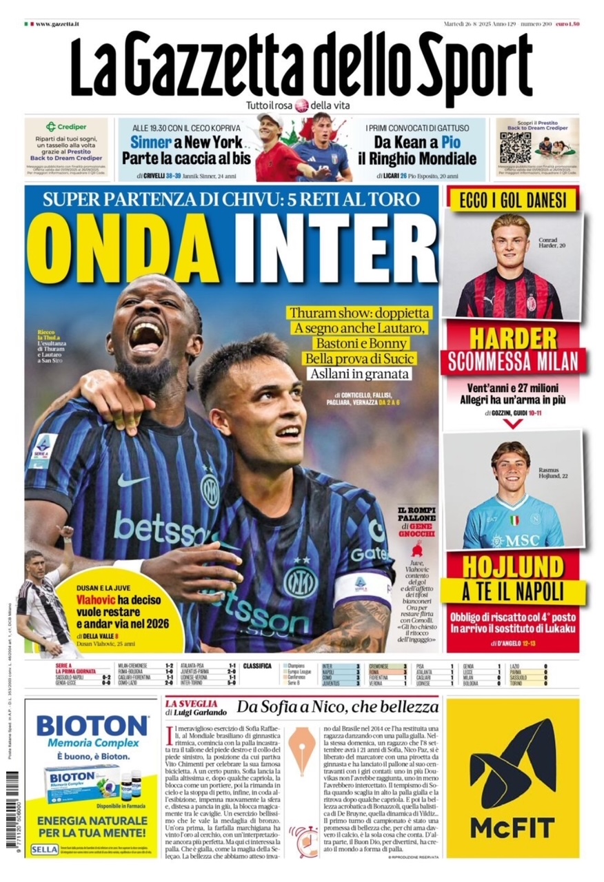 "Onda Inter" è il titolo con cui si apre l’odierna edizione de La Gazzetta dello Sport, oggi in edicola, in riferimento alla travolgente vittoria per 5-0 dei nerazzurri contro il Torino, andata in scena ieri sera allo stadio di San Siro nella prima giornata del nuovo campionato di Serie A. Una partenza a dir poco esplosiva per l’Inter e per il suo nuovo allenatore, Christian Chivu, all’esordio ufficiale sulla panchina nerazzurra in campionato.