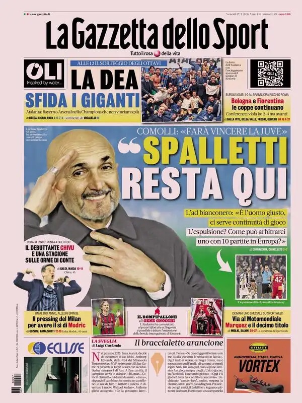 Nel taglio alto, invece, si parla delle coppe europee e delle tre italiane ancora in corsa in Champions, Europa e Conference League dopo aver superato il turno ai playoff e attese oggi dai sorteggi per gli ottavi di finale: "La Dea sfida i giganti. Atalanta: Bayern o Arsenal nella Champions che non vinciamo più. Bologna e Fiorentina, le coppe continuano. Europa League: 1-0 al Brann, ora rischio Roma. Conference, viola ko 2-4 ma avanti".