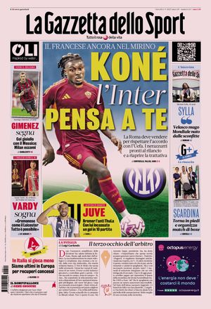 L'Inter non ha ancora rinunciato a Manu Koné. Il centrocampista della Roma, trattato per qualche giorno in estate dal club nerazzurro dopo il cambio di strategia adottato a causa delle note difficoltà con l'Atalanta per arrivare ad Ademola Lookman, resta un obiettivo caldo per le prossime sessioni di mercato. Questo, almeno, quanto scrive oggi La Gazzetta dello Sport nella sua prima pagina: "Koné, l'Inter pensa a te - si legge nel titolo di apertura -. Il francese ancora nel mirino. La Roma deve vendere per rispettare l'accordo con l'UEFA. I nerazzurri pronti al rilancio e a riaprire la trattativa".