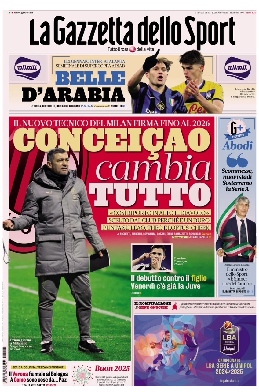 "Conceicao cambia tutto" è il titolo con cui si apre l'odierna edizione de La Gazzetta dello Sport l'ultima di questo 2024. Il nuovo tecnico del Milan ha messo la firma sul contratto che lo legherà ai rossoneri fino al 2026. La scelta è stata del club perché è un duro. Punta molto su Leao, Theo e Loftus-Cheek. Debutterà contro il figlio, venerdì c'è già la Juventus.