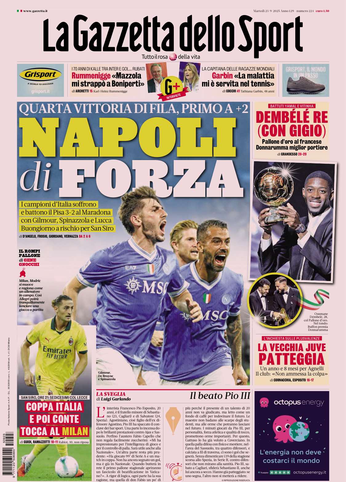 "Napoli di forza. Quarta vittoria di fila, primo a +2", apre così in prima pagina La Gazzetta dello Sport nell'edizione odierna, parlando del successo grazie al quale gli azzurri di Antonio Conte si piazzano da soli in vetta alla classifica. Il sommario: "I campioni d'Italia soffrono e battono il Pisa 3-2 al Maradona con Gilmour, Spinazzola e Lucca. Buongiorno a rischio per San Siro". In taglio basso, spazio ai rossoneri di Max Allegri che sono attesi da sue sfide importanti: "Coppa Italia e poi Conte: tocca al Milan". Di seguito la prima pagina integrale.