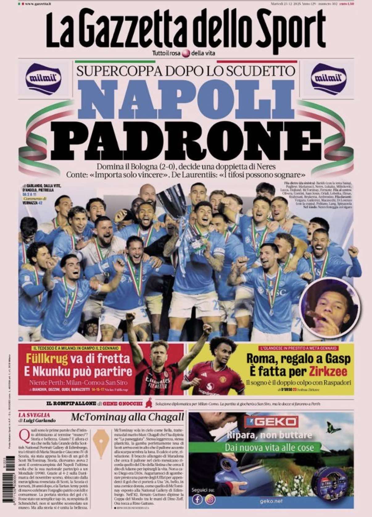 "Napoli padrone. Supercoppa dopo lo Scudetto", scrive così in prima pagina La Gazzetta dello Sport nell'edizione odierna, dedicando l'apertura al trionfo degli azzurri a Riyadh. Il sommario: "Domina il Bologna (2-0), decide una doppietta di Neres. Conte: «Importa solo vincere». De Laurentiis: «I tifosi possono sognare»". Di seguito la prima pagina integrale.