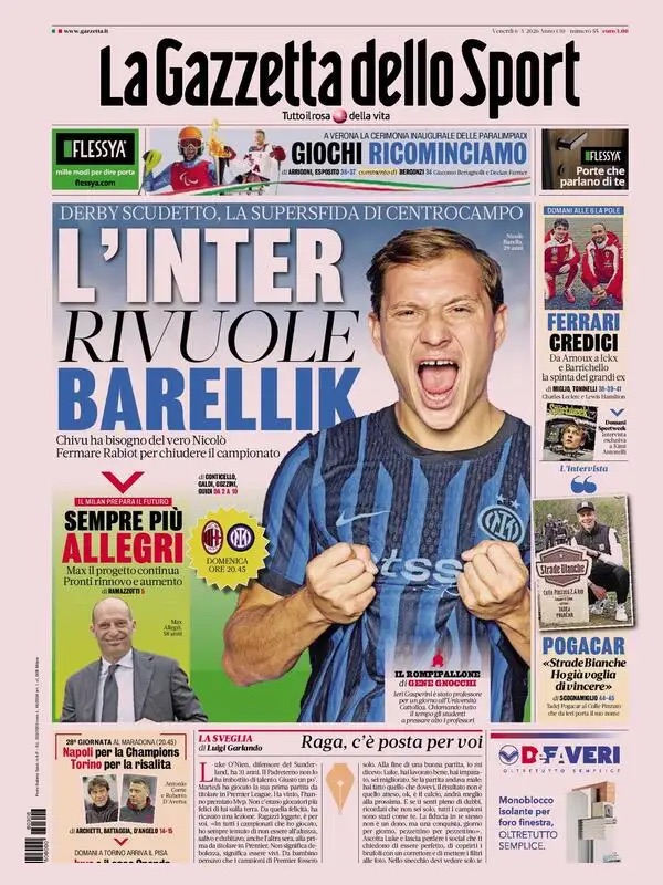 "L'Inter rivuole Barellik - titola la rosea - Derby scudetto, la super sfida di centrocampo. Chivu ha bisogno del vero Nicolò. Fermare Rabiot per chiudere il campionato". Sempre a centro pagina spicca il box dedicato al Milan di Massimiliano Allegri, secondo il quotidiano vicino al rinnovo di contratto con il club rossonero: "Sempre più Allegri. Max, il progetto continua: pronti rinnovi e aumento. II Milan prepara il futuro".