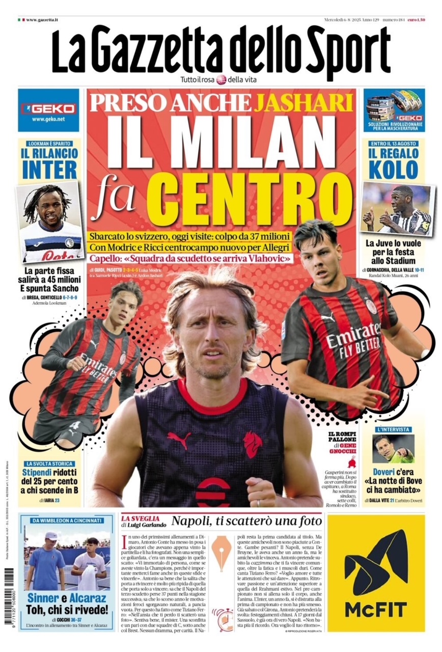 "Il Milan fa centro" è il titolo con cui si apre l'odierna edizione de La Gazzetta dello Sport oggi in edicola in merito al mercato rossonero. Finita la telenovela Jashari, lo svizzero è sbarcato a Milano. Oggi farà le visite mediche: colpo da 37 milioni di euro. Con Modric e Ricci il centrocampo nuovo per Allegri è completato.