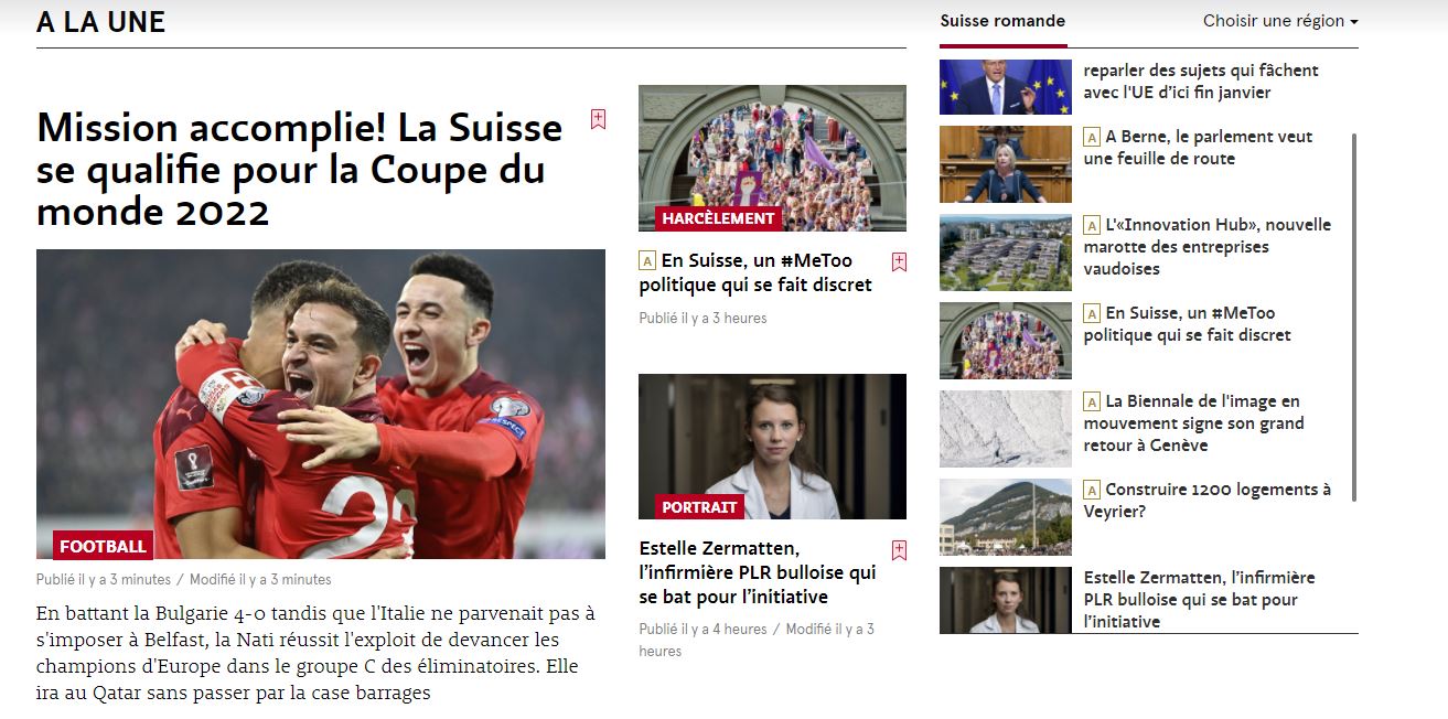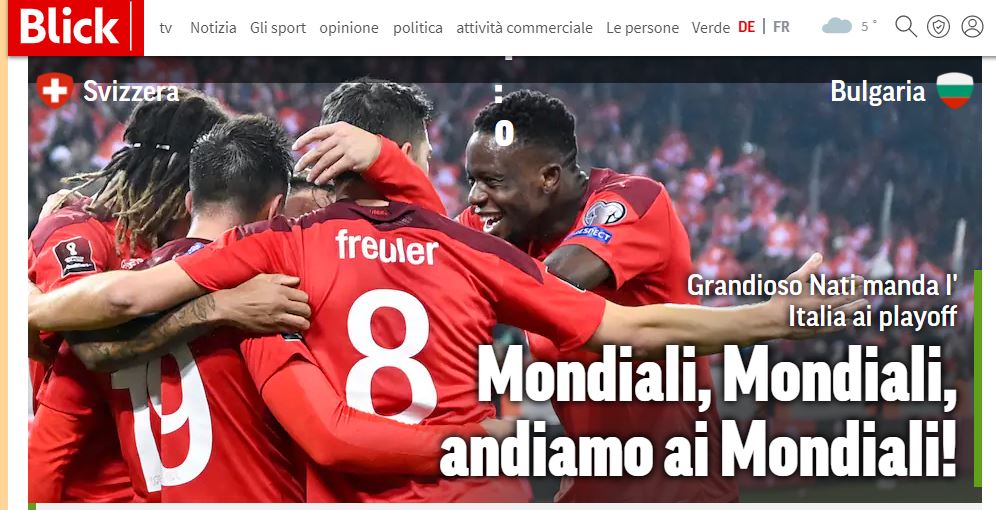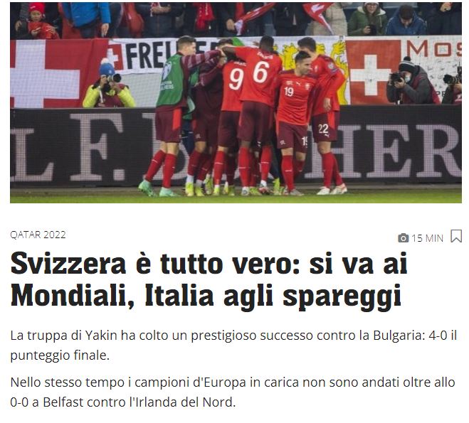 Grande festa in Svizzera per la qualificazione al Mondiale in Qatar 2022. L'edizione online del quotidiano Blick scrive in apertura: "Mondiali, Mondiali, andiamo ai Mondiali!". Il Corriere del Ticino, quotidiano svizzero in lingua italiana apre la versione online titolando: "Svizzera è tutto vero: si va ai Mondiali, Italia agli spareggi". Anche l'edizione del quotidiano in lingua francese Le Temps celebra gli elvetici titolando: "Missione compiuta! La Svizzera si qualifica per i Mondiali 2022".
