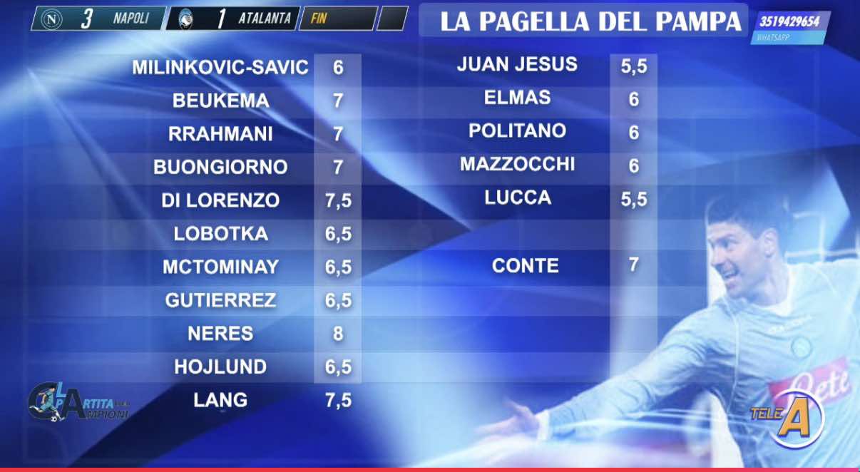 Roberto 'El Pampa' Sosa, ex calciatore azzurro, ai microfoni di Tele A nel corso de 'La Partita dei Campioni' ha dato le sue pagelle per Napoli-Atalanta 3-1: .“7 a Conte ed ai 3 difensori. Non era facile cambiare ed era la prima volta insieme a tre. Collego per questo motivo i voti col mister. Neres invece da 8. Il Napoli ha giocato bene e bisogna raccontare questo, così come prima dovevamo dire altro perché è il nostro mestiere”.
