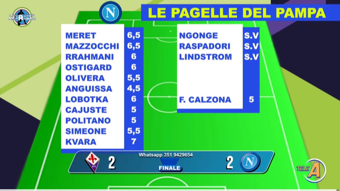 Nel corso de La Partita dei campioni su Tele A il Pampa Sosa ha spiegato le sue pagelle per la partita del Napoli contro la Fiorentina, terminata sul risultato di 2-2 con le reti di Rrahmani e Kvaratkshelia per gli azzurri e Biraghi e Nzola per i viola.