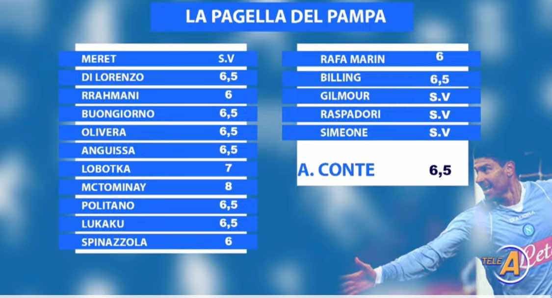 L'ex attaccante azzurro Roberto 'Pampa' Sosa, ai microfoni di Tele A nel corso de 'La Partita dei Campioni', ha stilato le sue pagelle per Napoli-Torino 2-0. McTominay, autore della doppietta decisiva, è l'indiscusso migliore in campo. Prestazione da 8 per lo scozzese. 7 invece per Lobotka, che tiene il controllo del centrocampo. Tutti sopra la sufficienza gli altri azzurri. 6,5 per Antonio Conte che è costretto ai cambi di Anguissa e Buongiorno per l'infortunio di questi nella ripresa. Di seguito tutte le pagelle