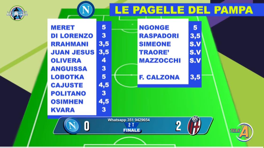 Ecco le pagelle del Pampa Sosa per la partita del Napoli contro il Bologna, terminata sul risultato di 0-2 per i felsinei con le reti di Ndoye e Posch, nel corso della Partita dei campioni su Tele A. L'ex calciatore azzurro non fa sconti, queste le sue parole: