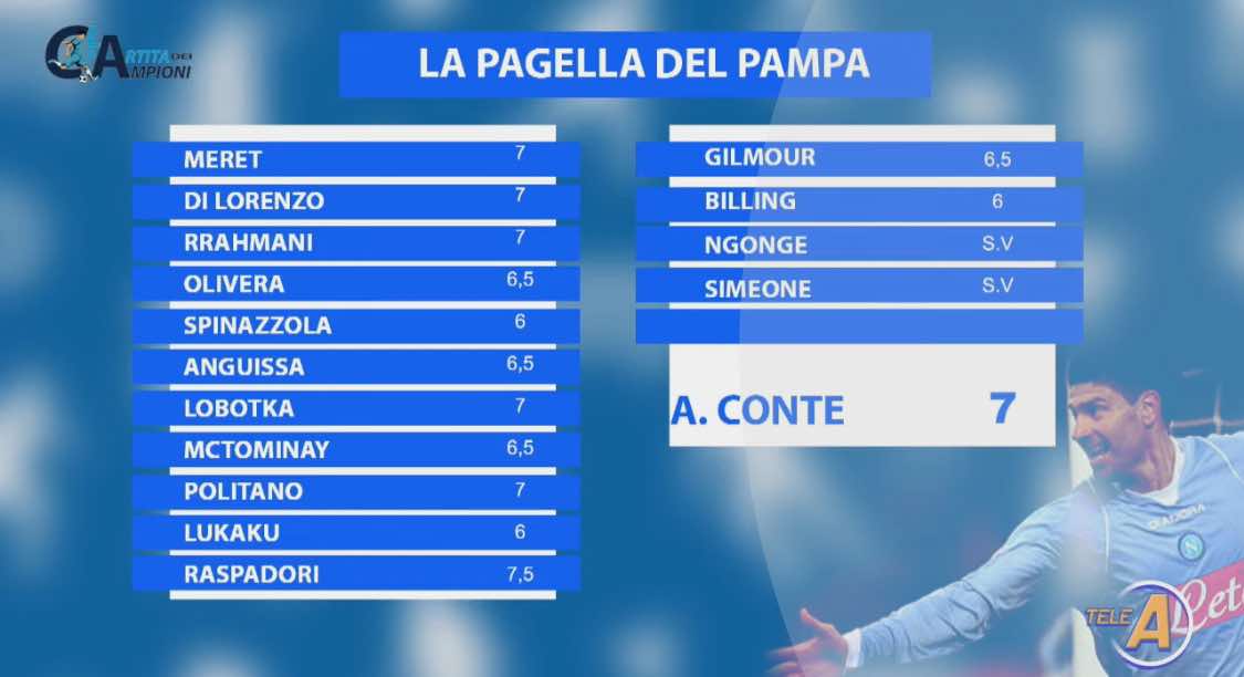 Ben 5 azzurri con 7 in pagella per l'ex attaccante azzurro: Lobotka, Politano, Rrahmani, Di Lorenzo e Meret. 7 anche ad Antonio Conte, come i punti che mancano alla matematica conquista del tricolore da parte del Napoli. Di seguito tutte le pagelle