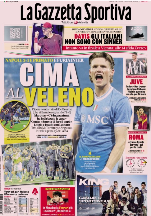"Cima al veleno". Questo il titolo in prima pagina dell'edizione odierna della Gazzetta dello Sport. Il riferimento è al successo del Napoli per 3-1 sull'Inter ieri sera al "Maradona" ma soprattutto alle polemiche che ci sono state al termine del match con Marotta che ha contestato l'operato del direttore di gara e Conte che ha parlato dell'atteggiamento dello stesso presidente nerazzurro. Senza tenere conto del litigio in campo fra l'allenatore azzurro e Lautaro.
