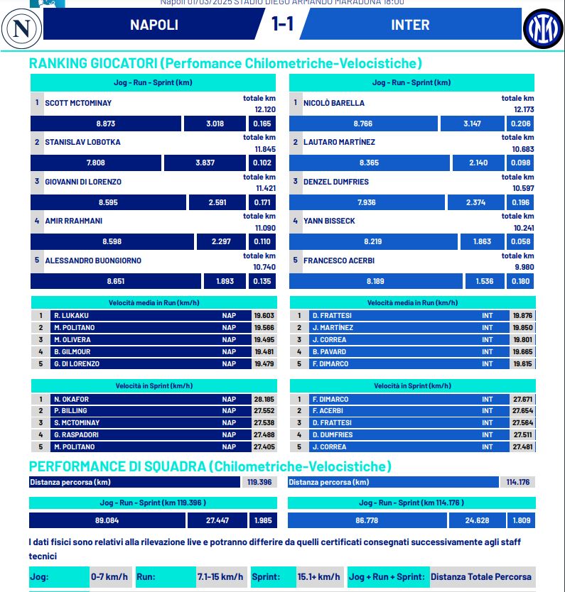 Nel corso del febbraio nero, in cui il Napoli è riuscito a racimolare appena tre pareggi e una sconfitta in quattro partite, si è parlato anche di un possibile problema di condizione per gli azzurri, alla luce del calo avuto nelle ultime gare. Ma i dati, anche quelli contro l'Inter, smentiscono questa tesi.