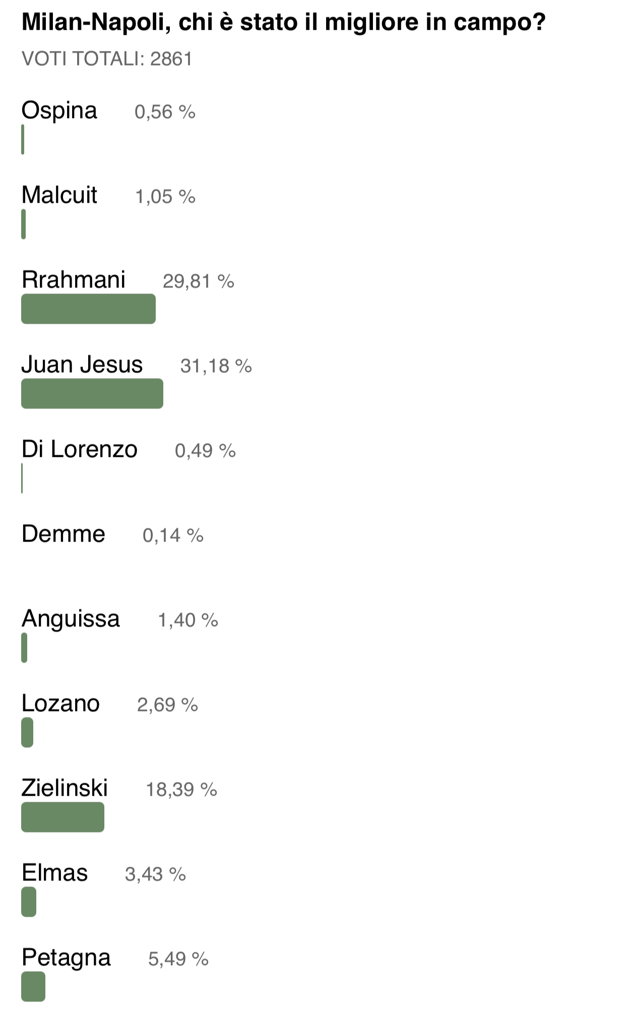 Il difensore del Napoli Juan Jesus si aggiudica la palma di migliore in campo contro il Milan. I tifosi azzurri, rispondendo al sondaggio proposto dalla nostra redazione, hanno scelto lui come giocatore migliore contro i rossoneri. Il brasiliano conquista la prima posizione totalizzando il 31,20 %. Al secondo posto si piazza il compagno di reparto Amir Rrahmani con il 29,80 %. Terzo posto per Zielinski, mentre il match winner, Elmas conquista solo il 3,43 %. Rispondi al nostro sondaggio su Tuttonapoli.net. (Qui per votare)
